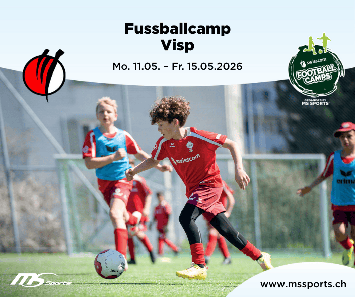 Dieses Jahr findet im Frühling vom *Montag, 11.05 bis Freitag, 15.05.26* wieder das Swisscom Football Camp auf *dem Sportplatz Mühleye in Visp* statt 😊⚽!